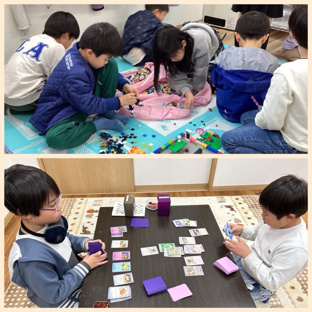カップタワーや、ポケモンカードゲーム、ラキュー、レゴなどそれぞれ好きな遊びに夢中です❣️