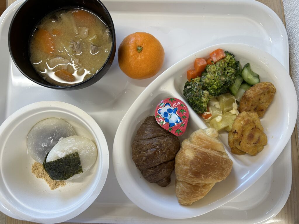 出来たおもちは、バイキング給食であんこや、きな粉、砂糖しょうゆ、海苔をつけて食べました^_−☆